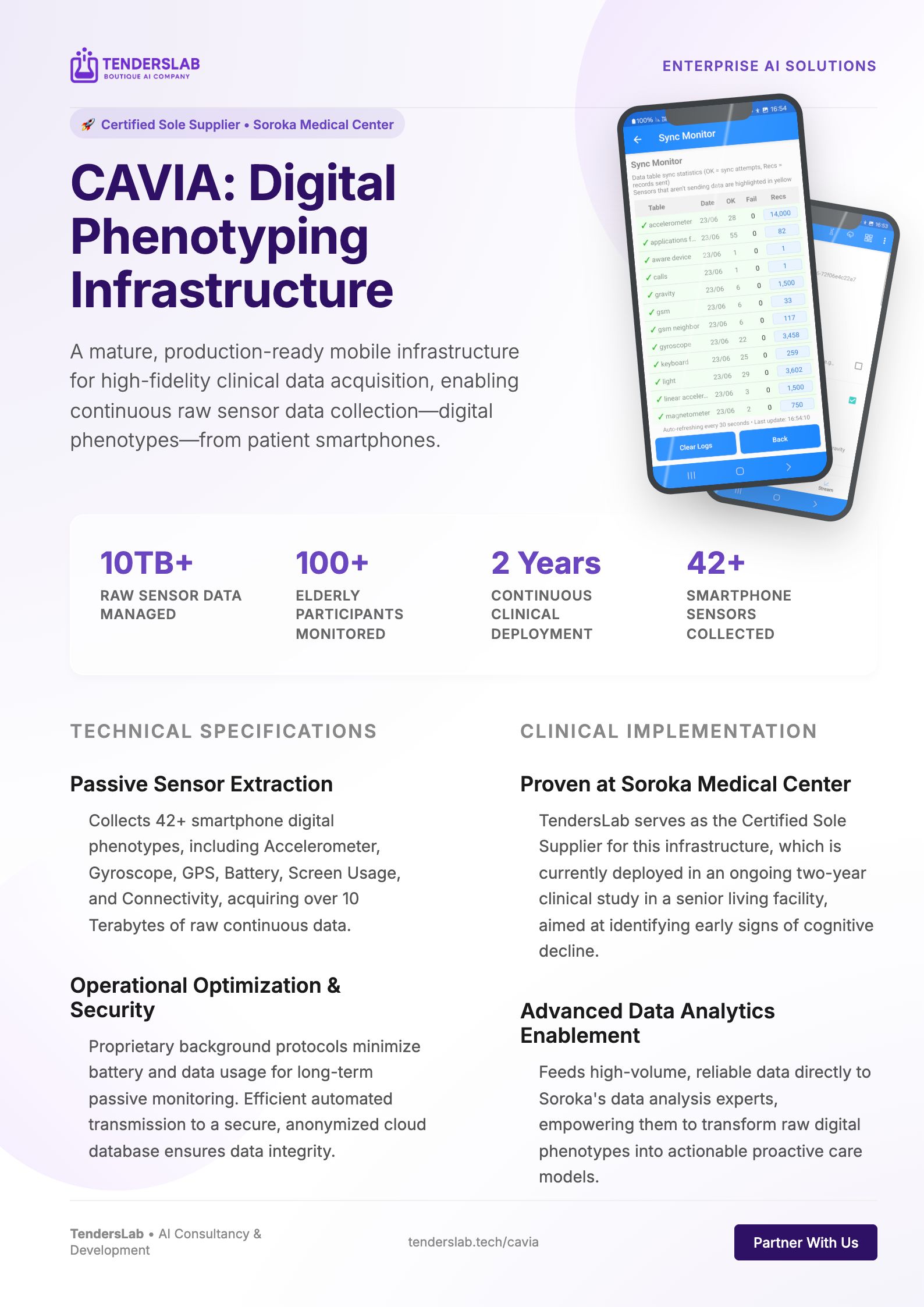 TendersLab serves as the Certified Sole Supplier for the CAVIA project currently deployed at Soroka Medical Center. The platform is running an ongoing two-year study involving hundreds of testers focused on analyzing continuous data to identify early signs of cognitive decline.