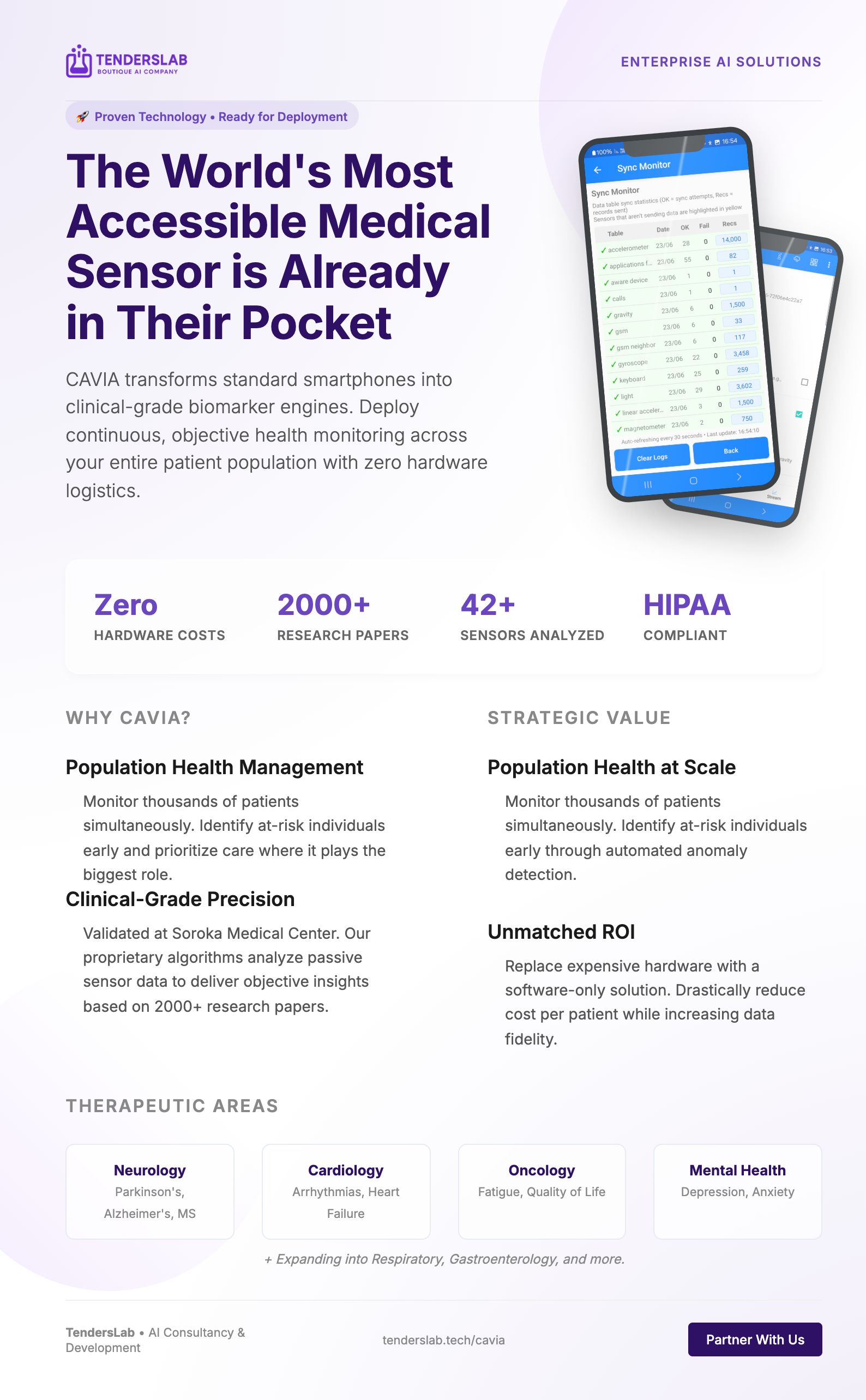 CAVIA has been validated with hundreds of participants at Soroka Medical Center, where TendersLab served as Certified Sole Supplier. We are expanding to new healthcare and research partners.